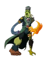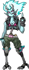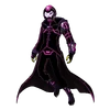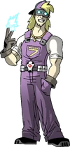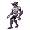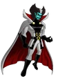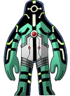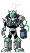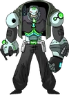 Dr. Animo has pale green skin, white hair, and sharp teeth. He wears a purple and black suit with machinery, he wears a helm the covers the top of his head.