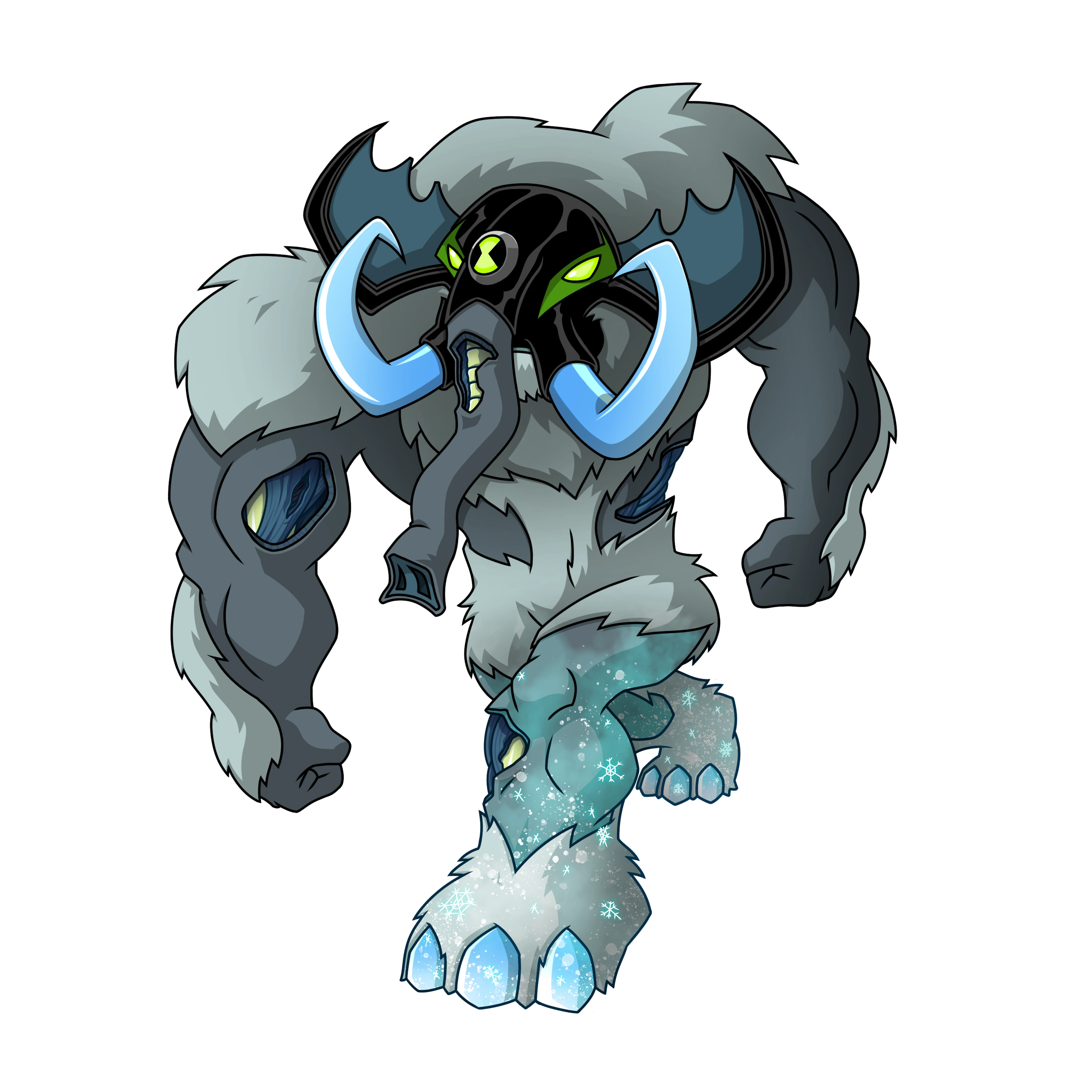 - Freezing Stomps- Slamming the ground with his powerful legs creates a freezing shockwave, immobilizing foes and freezing the surrounding environment.; every time he takes a step, a thin layer of ice is left in his tracks.