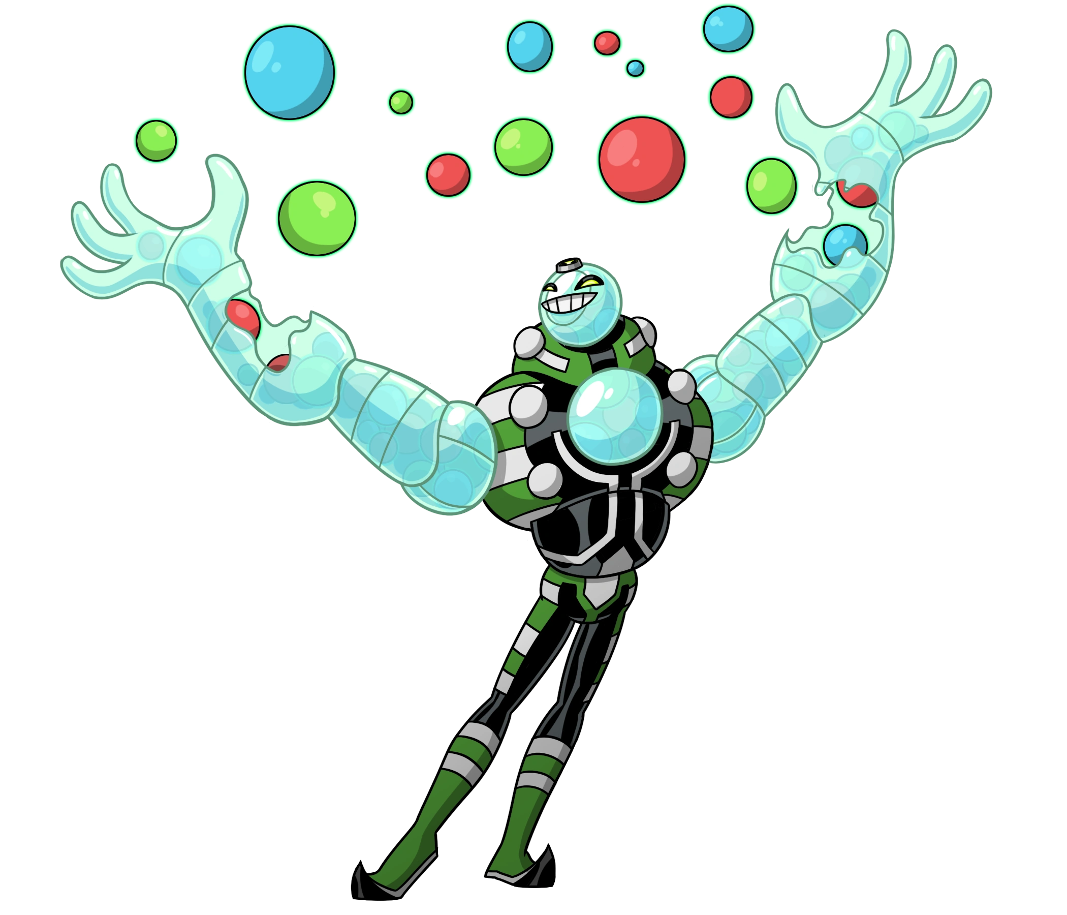 BallPit is a humanoid alien that consists of a clear shell with multicolored spheres underneath. He wears a green and black suit with white accents and white spheres surrounding the orb on his chest.