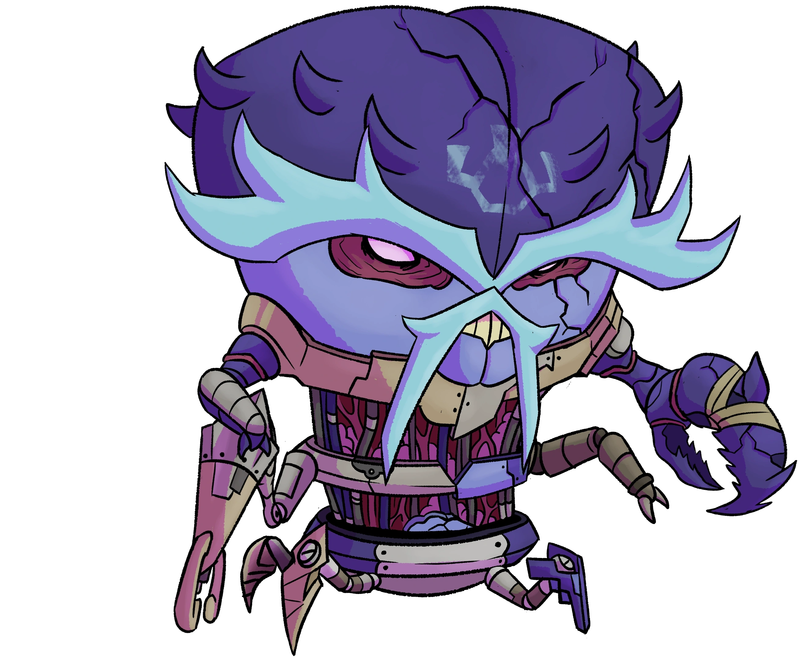 Dr. Psychobos is a pale-pink Cerebrocrustacean with a cracked purple shell. He has four large, light-blue head crests on his shell, one pair resembling eyebrows and the other a goatee. His shell consists of two plates that, when opened, reveal his brain, which is a pinkish-purple color. Psychobos' body has been infused with danish-pink cybernetics and his exposed intestines are covered in wiring. he has three mechanical claws along with one abnormally large organic pincer. His lower body features four bionic legs with spike-like feet.