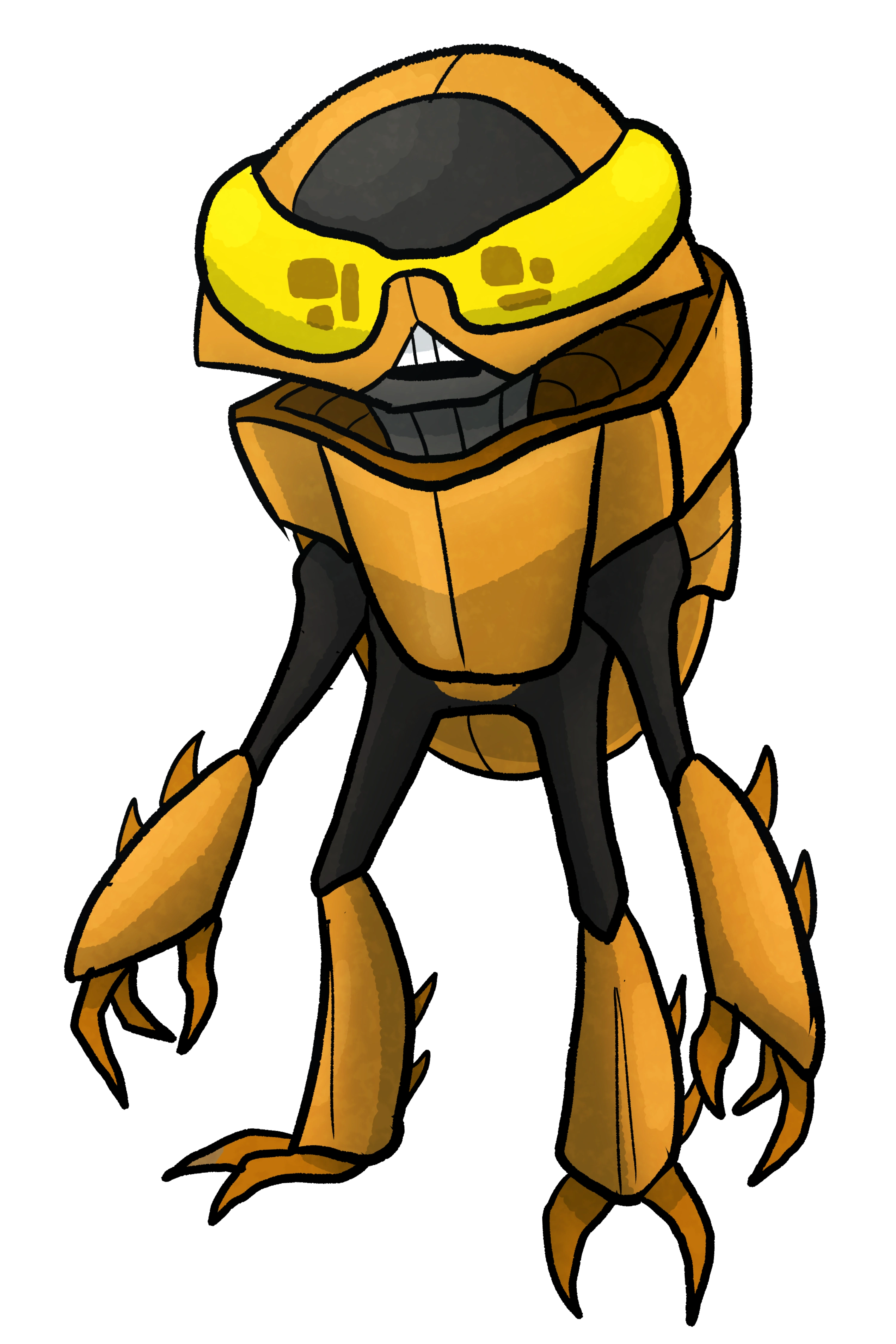 The Eter'Caneic were bipedal beetle-like humanoid aliens with a single merged eye. They had an orange or yellow and black shell that was most dense along their chests and back going down to their abdomen. They had black arms and legs with their wrists, hands, and lower legs being orange.