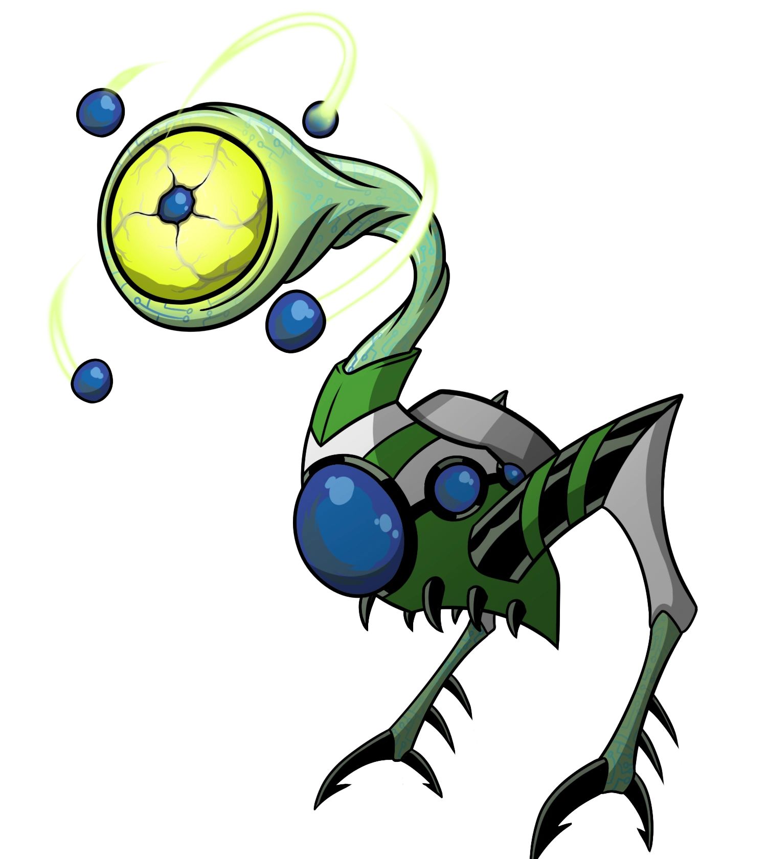 Isodope is an insectoid alien with 2 grasshopper-like legs, with 2 spiked black toes coming from the front and heel of each foot, and two small spikes on the back of each bottom segment. Its swan-shaped main body is adorned with 2 rows of 3 black spikes coming from the bottom, leading up to a large blue control-orb on its chest, connected by a black outline to 1 smaller blue orb on either side, and ending in 1 more smaller orb near its back. From the torso stems a mint-green, question-mark-like neck, ending shrivled orifice that holds a bright green, head-encompassing eye with 5 veins running from the outer circumference to a blue pupil. Around its "head" orbit blue proton/neutron-like orbs, similar in look to the ones attached to its body.