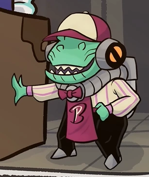Pakmar is a small light green alien with 2 mechanical looking eyes on the sides of his head. His outfit is composed of a metal tank with tubes wrapped around his neck at the front of which sits a maroon bow tie. Under that he wears a yellow and pink vertical striped shirt, black pants with grey tipped shoes and a maroon apron with has a logo made up of a yellow P inside black B.