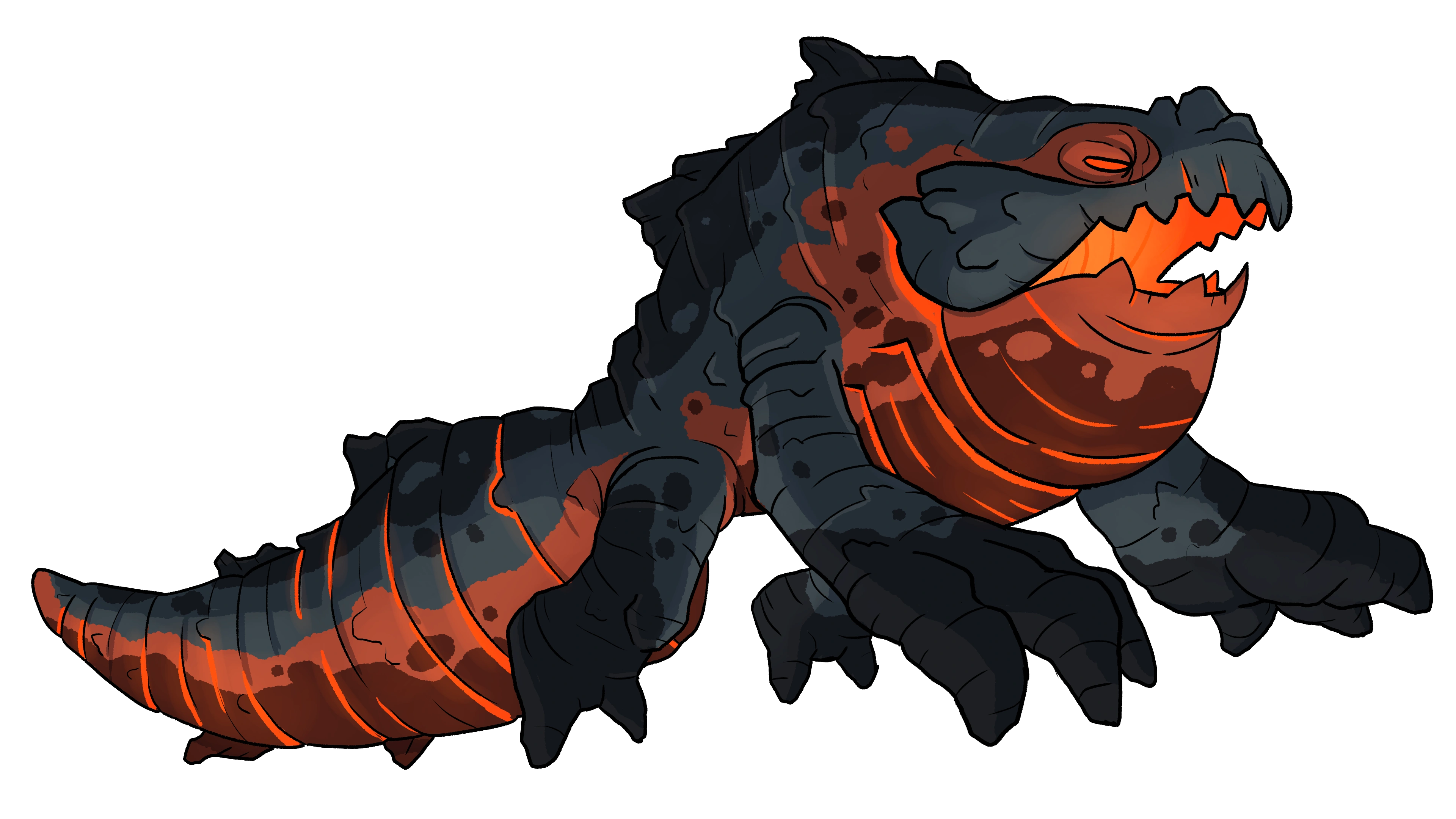 The Submar Manzardill are extremely large aquatic reptilian aliens, measuring up to seventeen feet in length, and are covered in thick, dark and magma-colored rock-like scales not too dissimilar to volcanic rock as a result of their large hypothermus constantly emitting heat and as a result, their inner mouths glowing an orange light. Their eyes are orange akin to lava and have large rocky feet and hands used to swim around, as well as a thick robust tail.