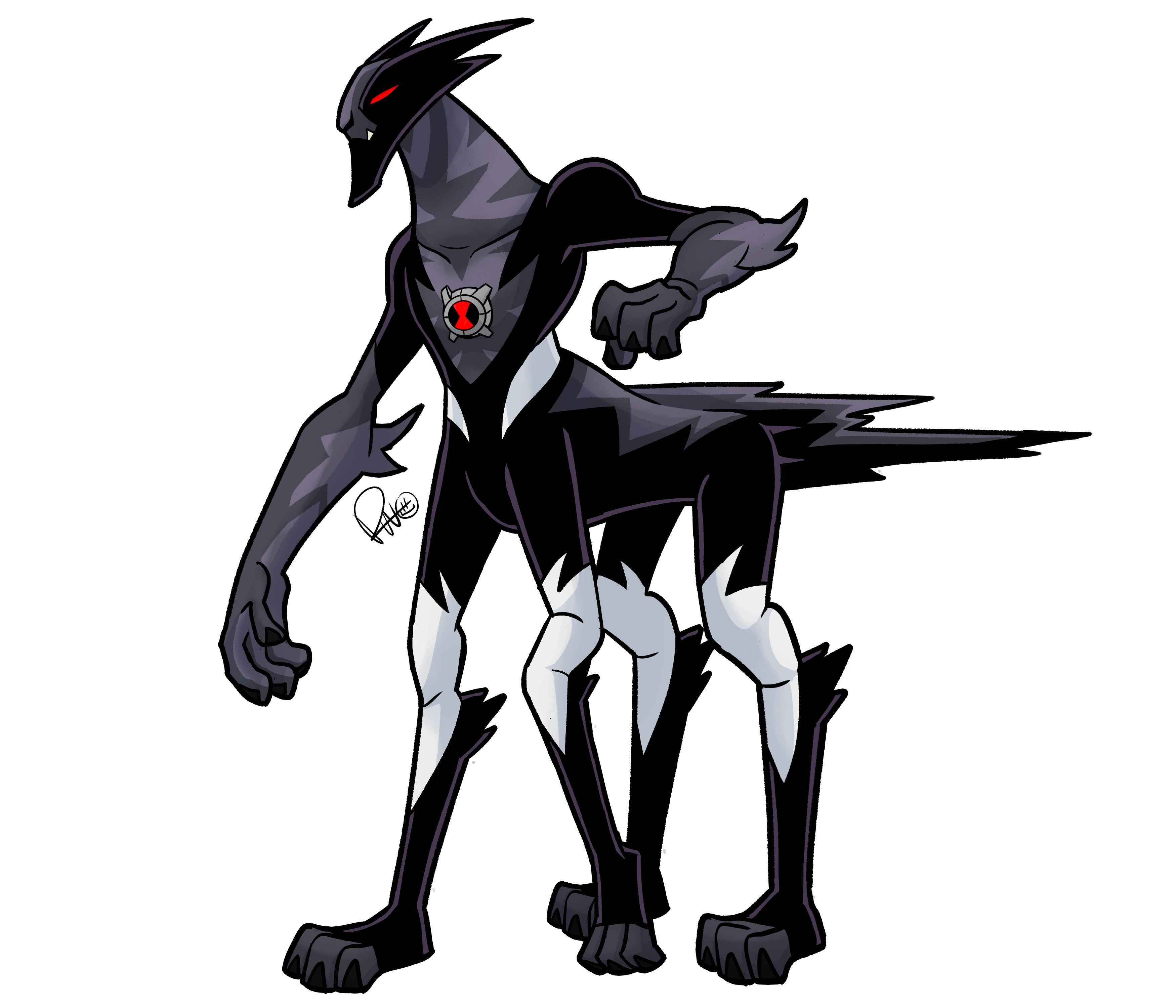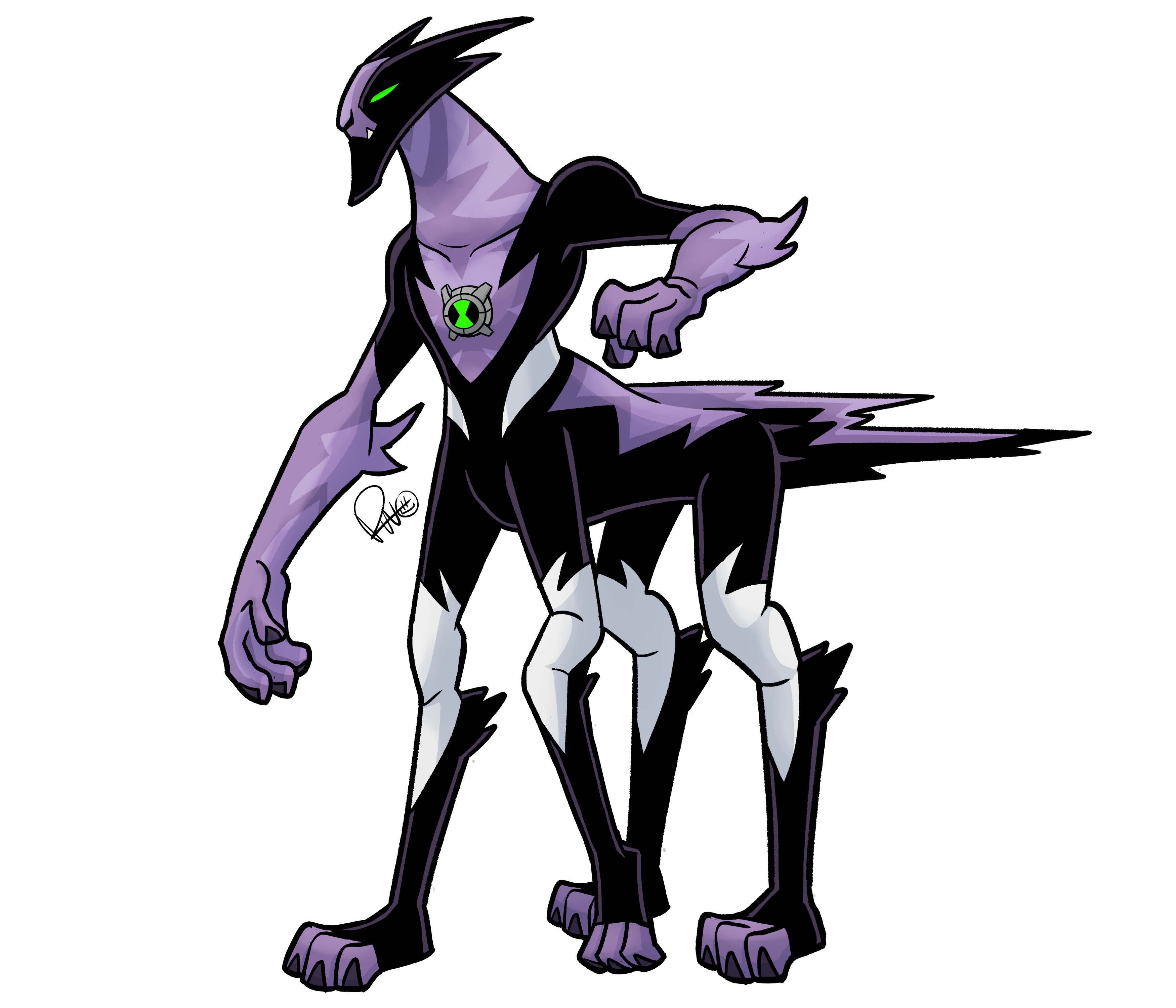 Ultimate Fasttrack is a quadrupedal feline centaur-like alien with grayish purple and black fur. He has a long tail shaped like a lightning bolt. He wears a black and white uniform.