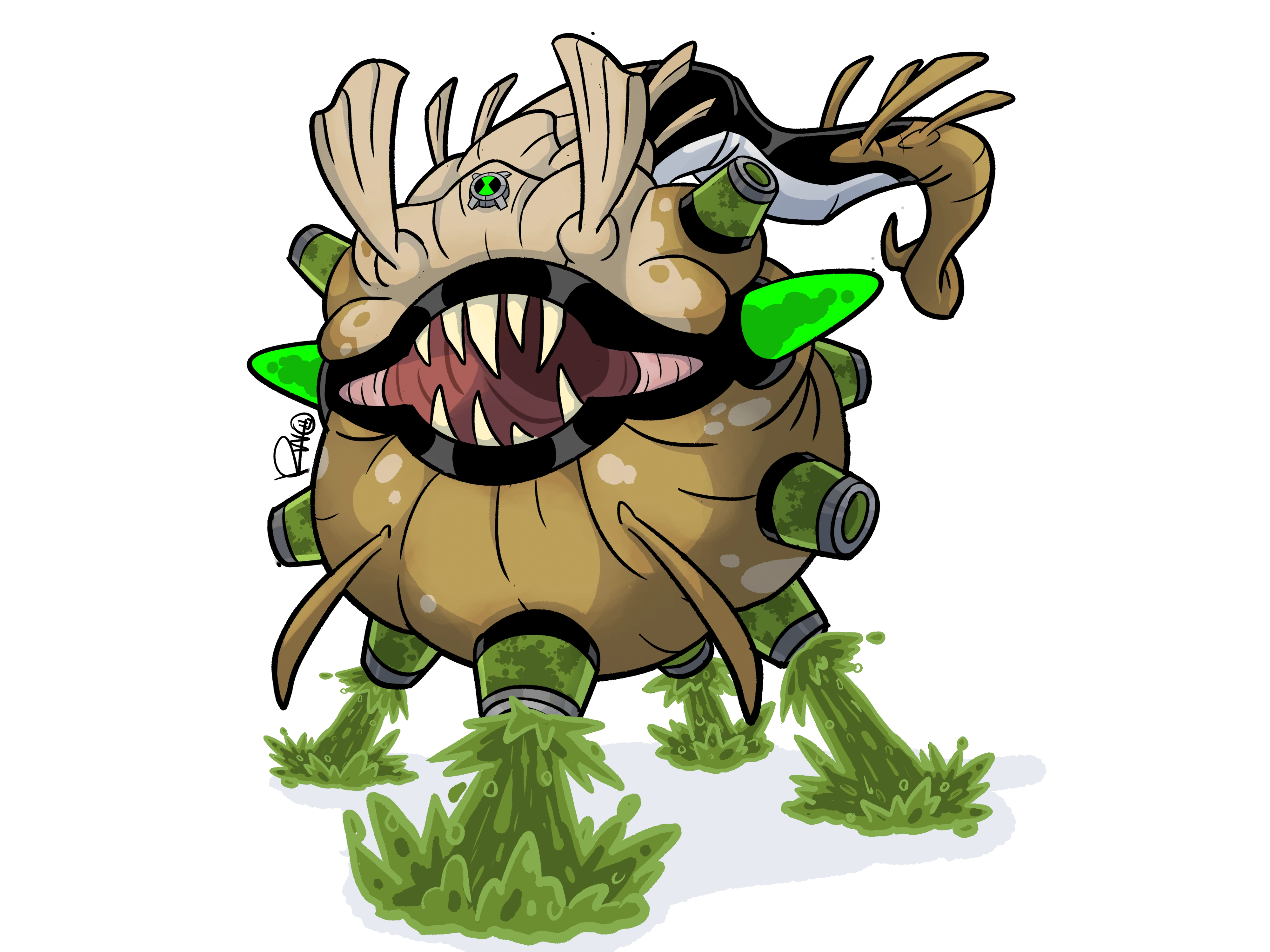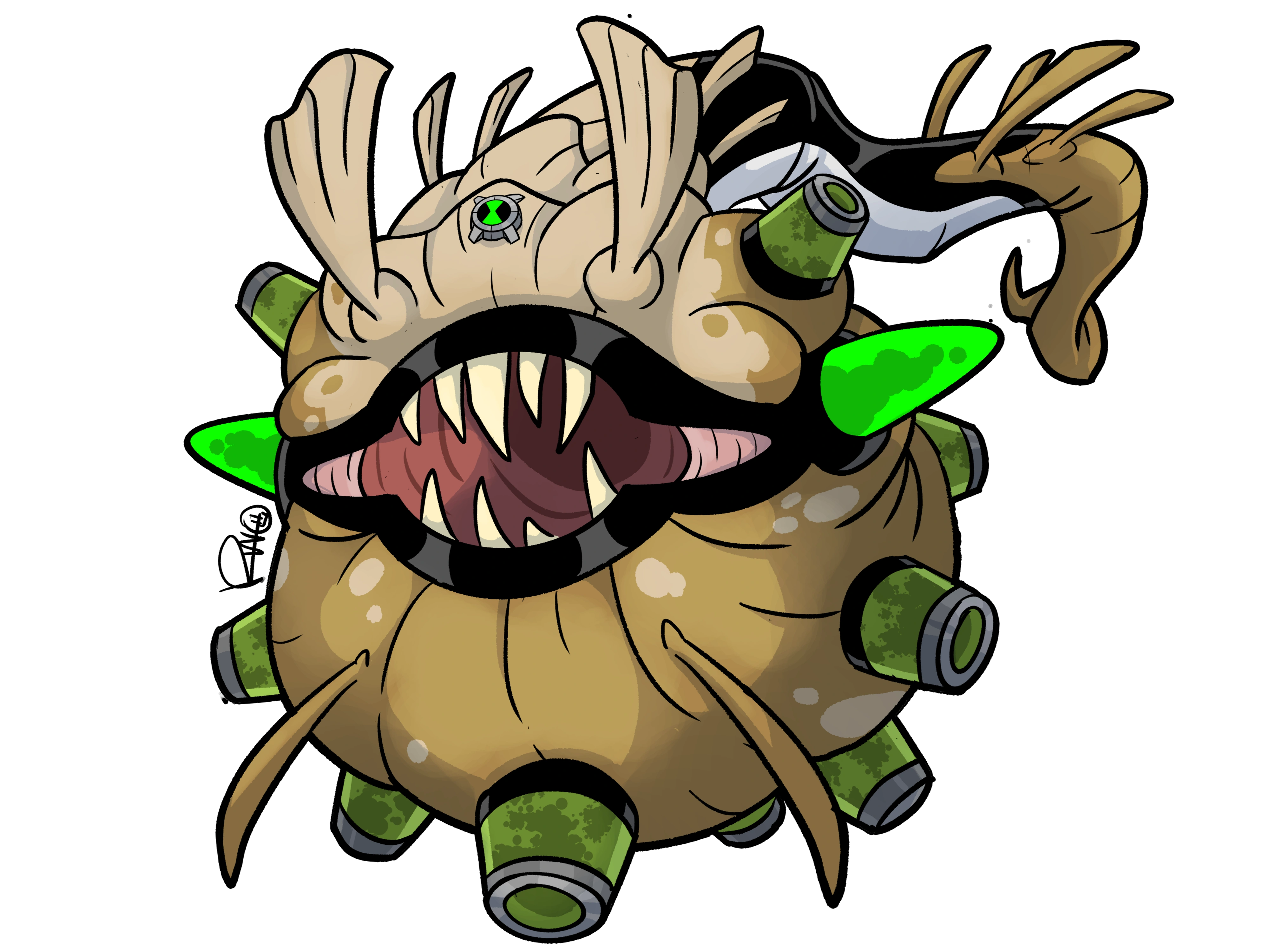 Ultimate Spitter is a dark green pufferfish-like alien, with a spherical body tubular slime cylinders covering its chest two triangular cylinders located next to his mouth, winged ears, no eyes, and a long tail.