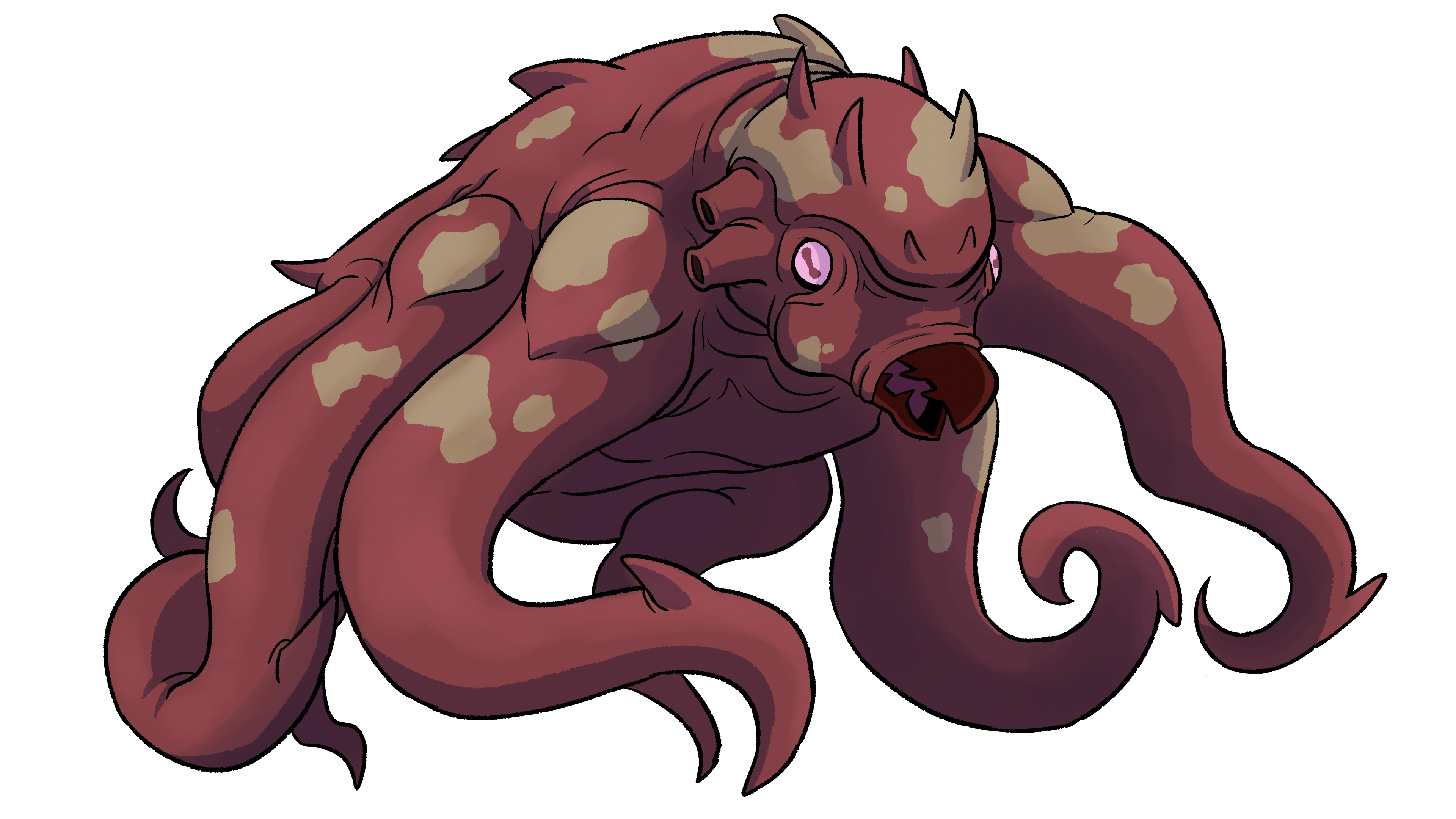 The Vicetopus is a large, light red alien resembling an octopus, with a long body and many long tentacles along its stomach. It has a beaked mouth, two large red eyes, and brown spots covering its back.