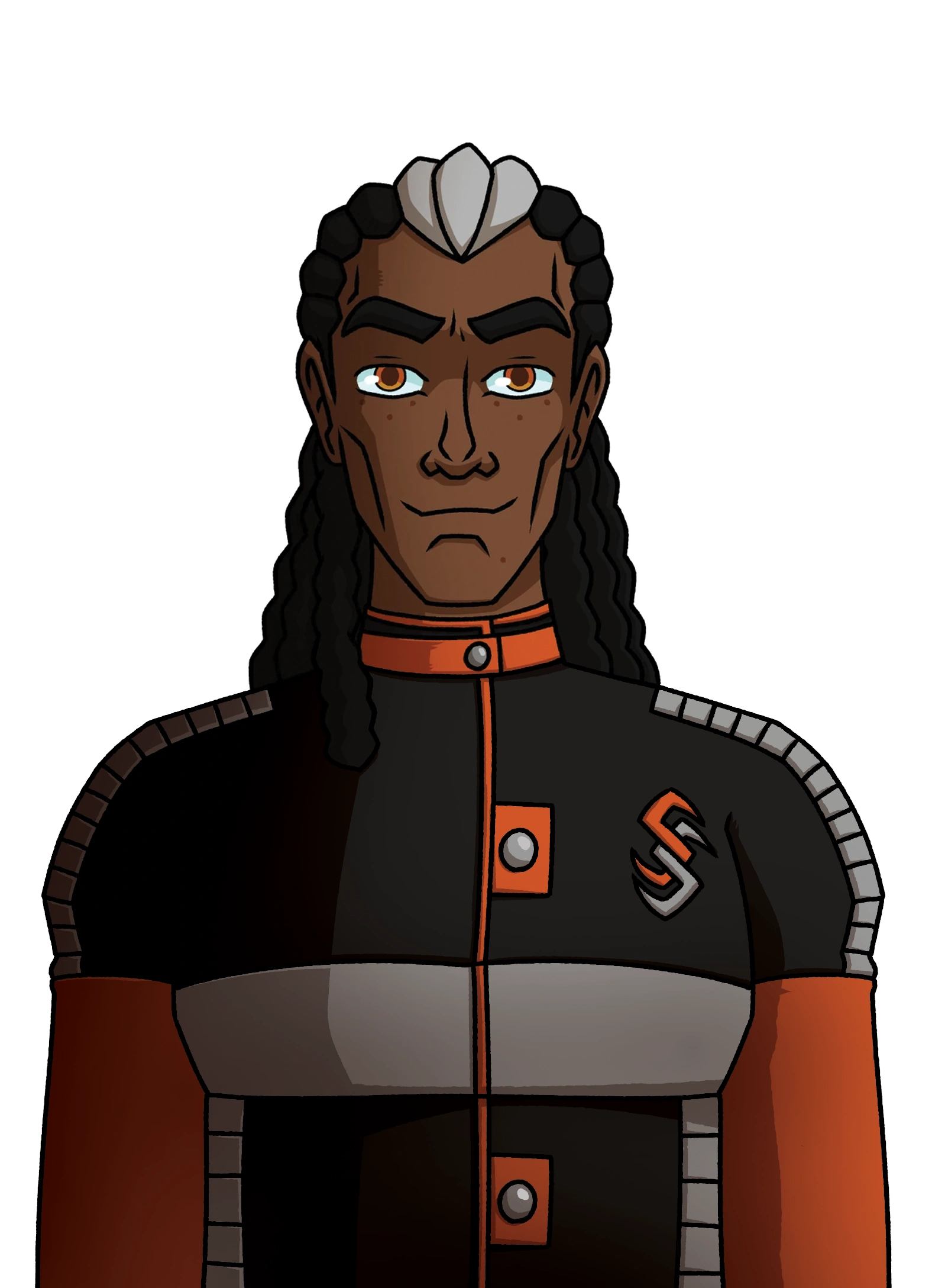 He wears a black uniform with orange sleeves and collar. The uniform features the Secret Scientists symbol on his heart.